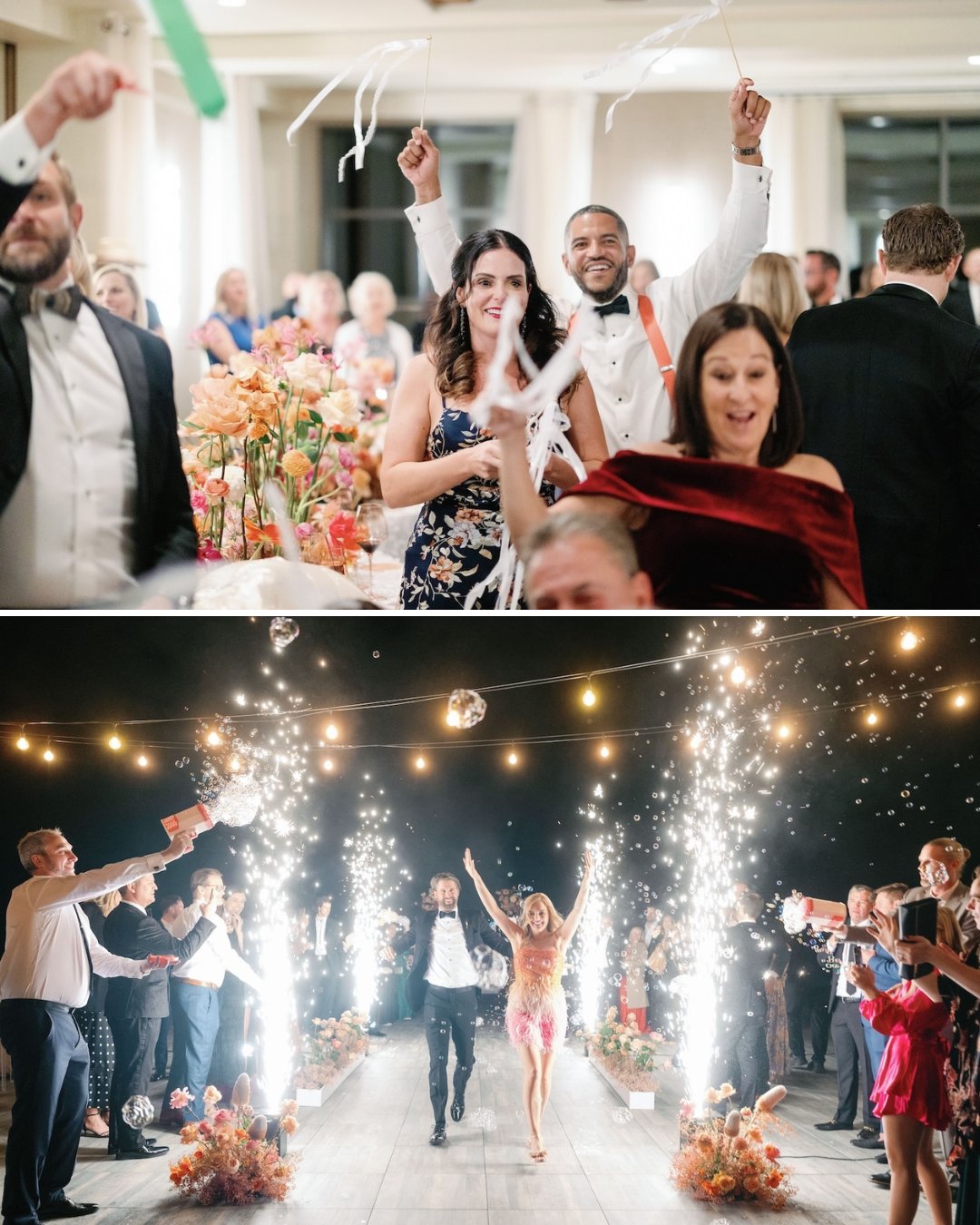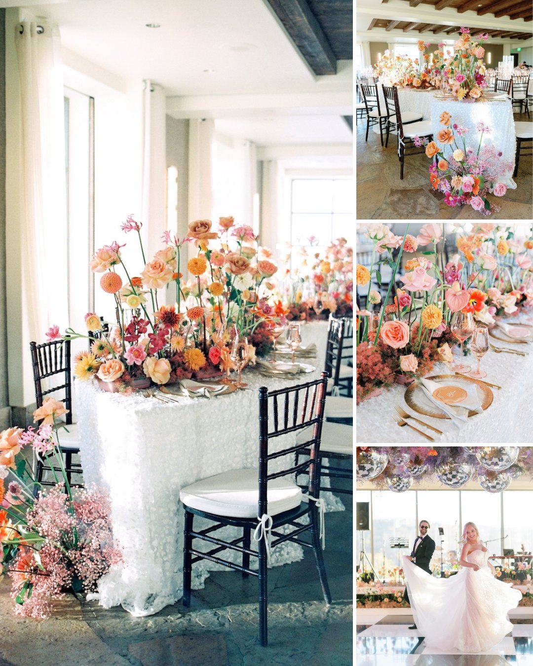 Dahlia Floral Design brought LeAnn’s vision vividly to life, pairing playful dahlias with garden roses in bursts of warm, saturated hues. Floral “clouds” floated above the reception dance floor, mingling with twinkling disco balls and candlelight, elevating the night into something truly otherworldly.