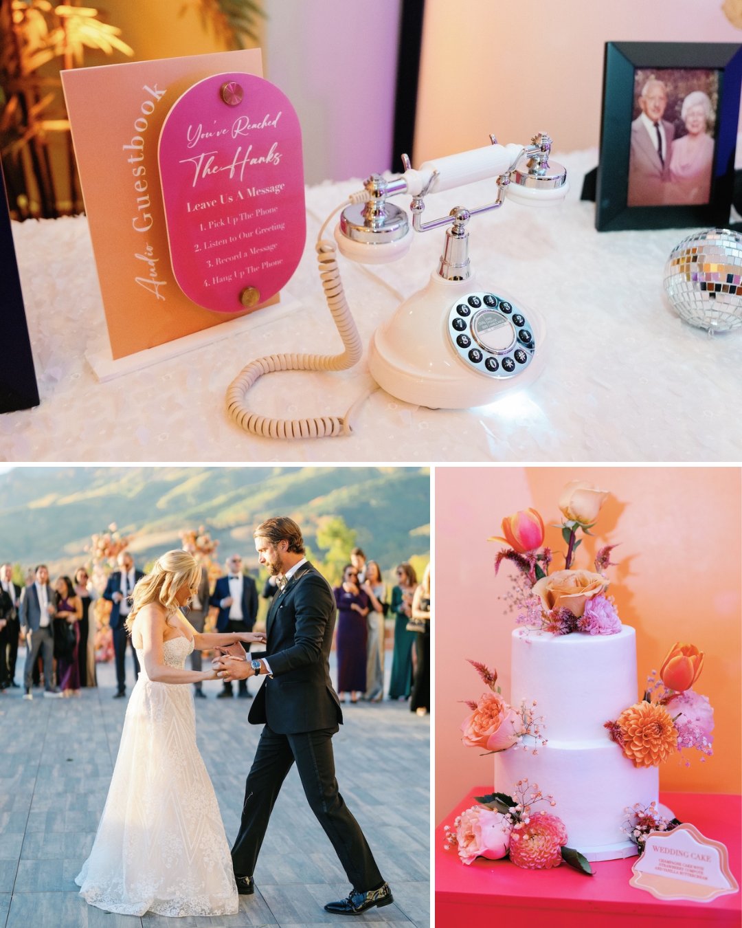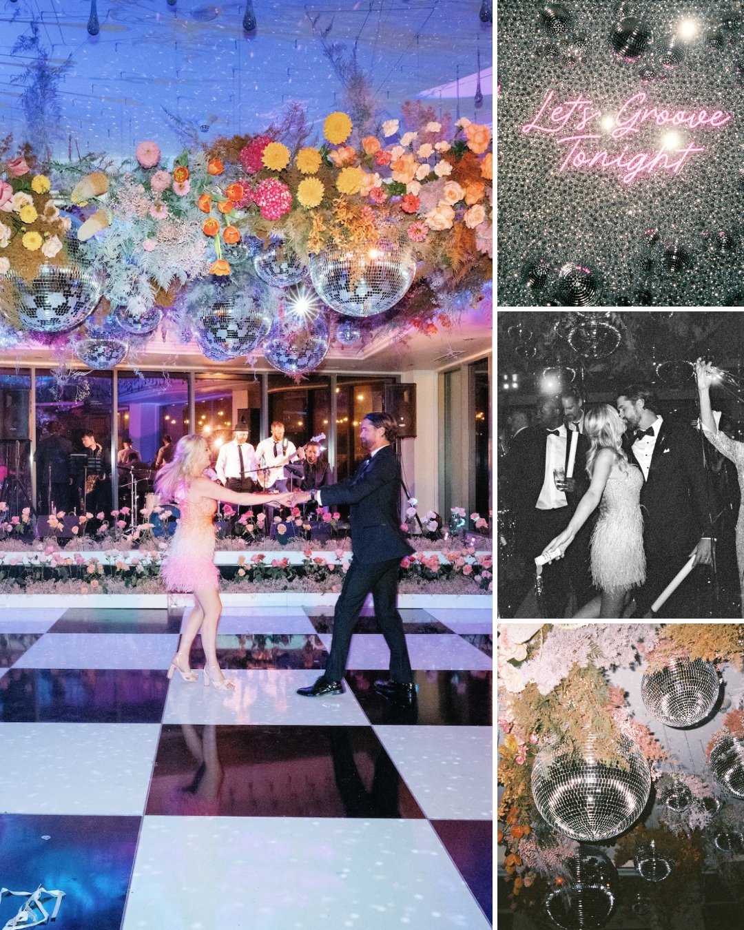 Guests hit the black-and-white checkered dance floor beneath floating florals and disco lights, the mood electric as Diamond Empire Band’s lead singer Dee brought the house down with every note. The couple’s first dance to “Sweet Symphony” by Joy Oladokun featuring Chris Stapleton embodied their love story—soulful, authentic, and completely their own.