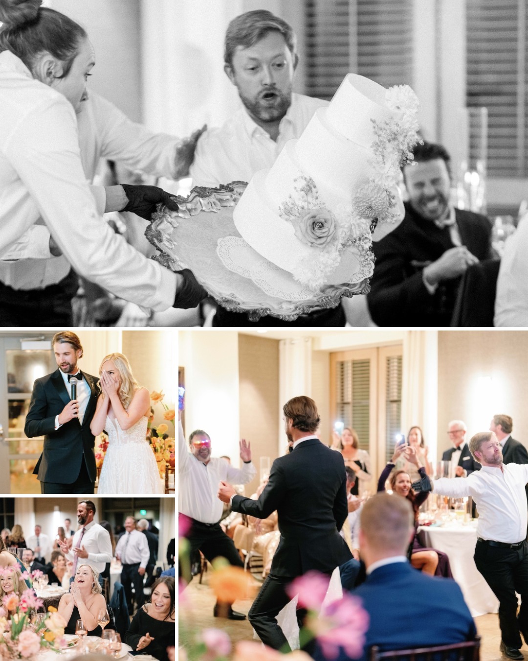 Among the evening’s most jaw-dropping moments? A surprise flash mob staged by the Telluride Theatre. Just as James began an impromptu speech, performers marched in with a towering wedding cake—only to drop it in front of stunned guests. The shock dissolved into cheers when James Brown’s “Get Up Offa That Thing” kicked in and the “cake catastrophe” turned into a choreographed dance party that swept everyone into the reception room.