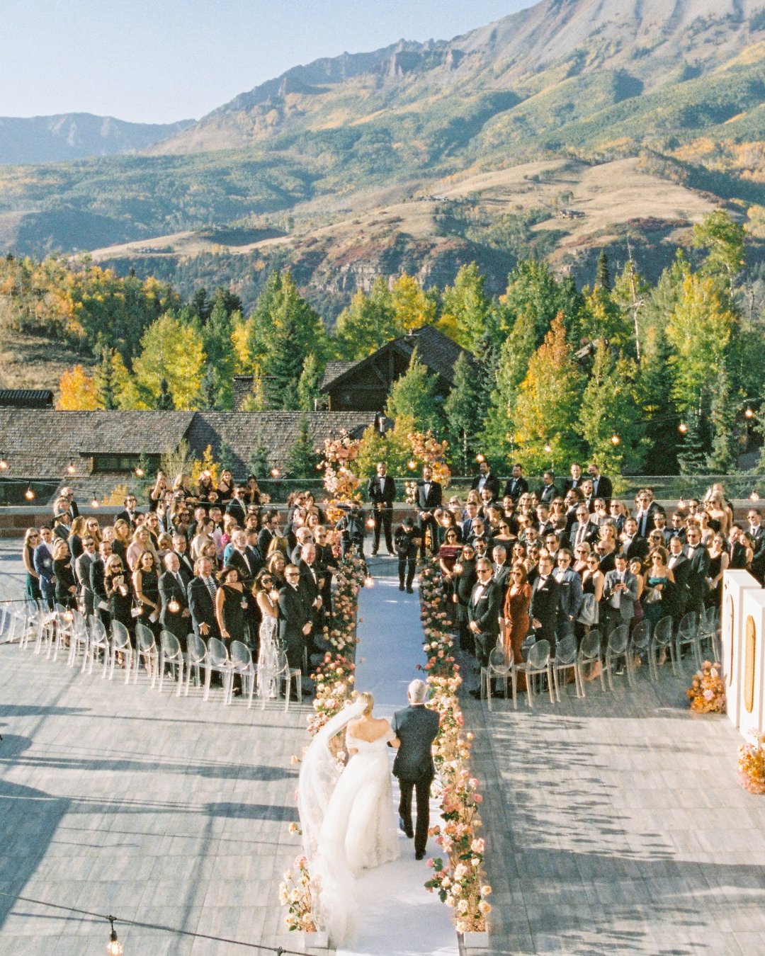 The couple’s ceremony unfolded beneath a radiant Telluride sun, with ghost chairs facing a floral altar installation framed by panoramic mountain views. Guests walked a floral-lined runway to find their seats—umbrellas thoughtfully provided to shield them from the bright alpine light.