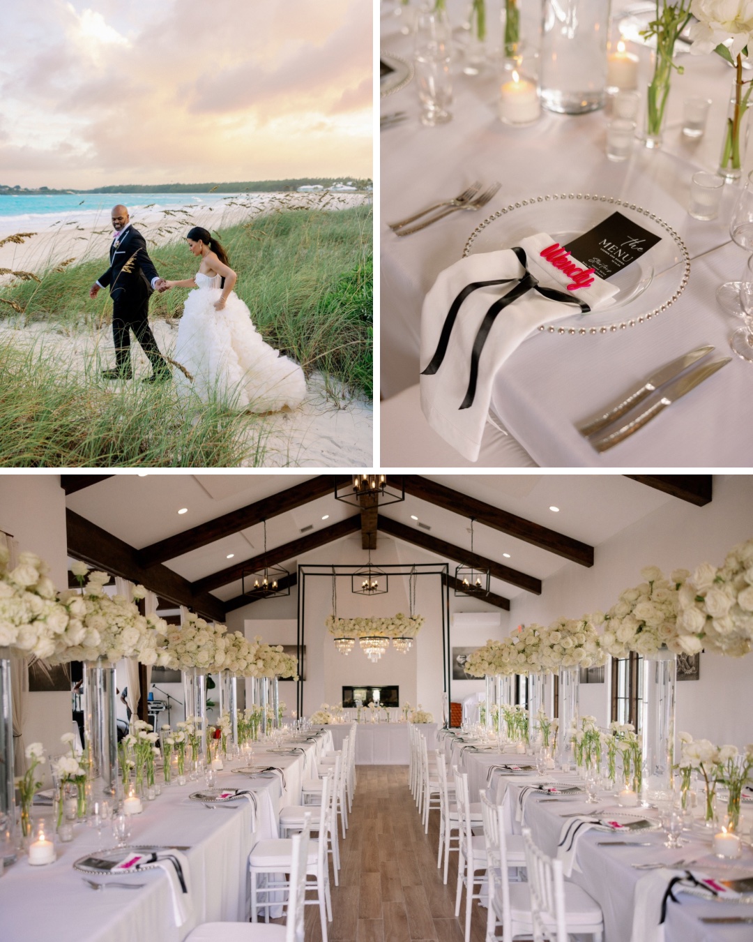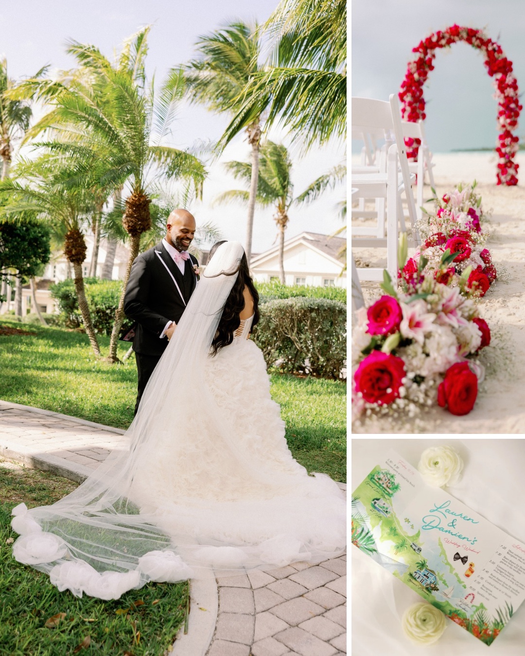 Vendors: Photography: Gaby Rguez; Reception Venue: Grand Isle Resort; Stationery: Custom Wedding Weekend Itinerary by Maya Simmons; Cake: Icing on the Cake; Hair & Makeup: MKUP The Beauty Studio; Bridal Gown Designer: Naama Navipur; Groom’s Attire: Thomas James; DJ & Production: DJ IGNITE