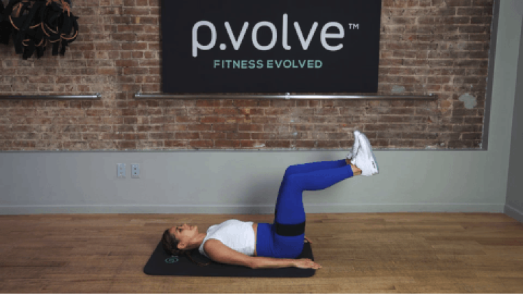 Lay with your back firmly on the mat, legs lifted into tabletop with knees at 90-degrees. Keep arms down by your sides and head resting on the mat. Keeping your left leg completely still, lower your right foot half-way down towards the bottom right corner of your mat. Pause, then pull the knee back in to start. Repeat 8 reps, then switch legs. Use with the p.ball for increased intensity.