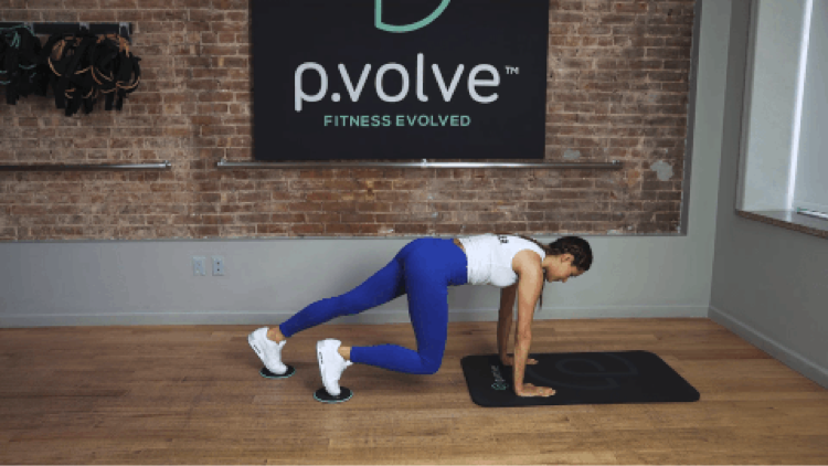 Start in a high plank position with each foot on a glider, feet hip distance apart. Slowly start to bring your right knee in towards your chest, but stopping the knee in line with your hips at a 90-degree bend. Slowly press the right leg straight while at the same time bringing the left knee in. Continue to alternate slowly, keeping the feet hips distance apart, for 8 reps on each side.
