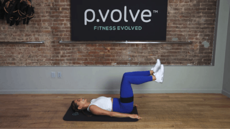 Lay with your back firmly on the mat, legs lifted into tabletop with knees at 90-degrees. Keep arms down by your sides and head resting on the mat. Flex the feet and slowly start to shift the feet forward 1-3 inches without fully extending the knees. Pause, then bring the knees back in line with the hips. Repeat for 8 reps. Use with p.ball for increased intensity.