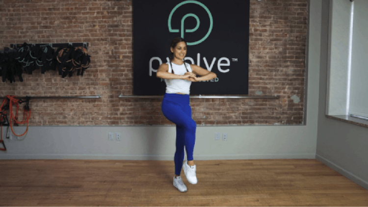 Stand with right knee bent at 90-degrees in front of you, and a soft bend in the standing leg with fingers interlaced behind your head. Flex your lifted foot, and slowly extend the knee, pressing your right foot out at an angle in front of you. Keeping the foot hovered, slowly rebend the knee, returning to a 90-degree angle at hip height. Repeat 8 reps, then switch legs.