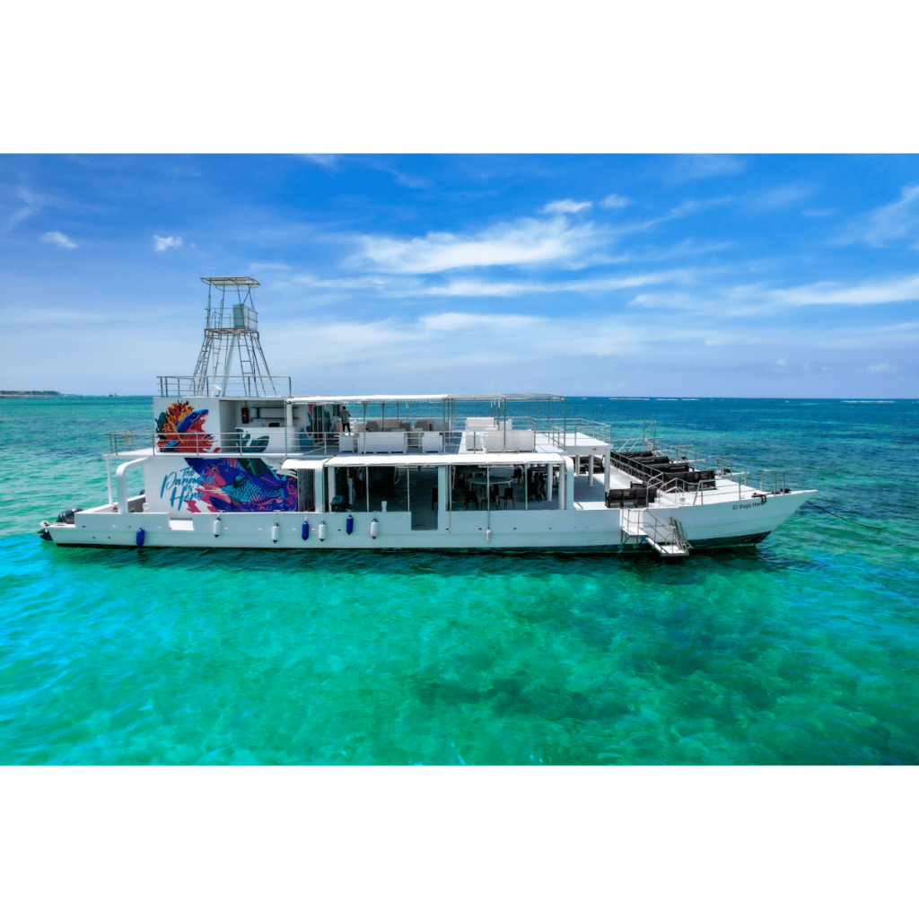 With a capacity for more than 300 guests, Karaya ensures a comfortable and spacious venue, boarding comfortably with a platform boat. The catamaran navigates along the coast of Bávaro to the natural pool, with the opportunity to snorkel in artificial reefs and structures made by the Bavaro Reefs foundation with plenty of fish and corals.